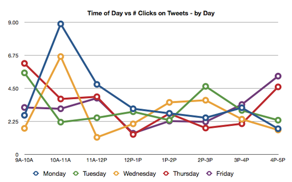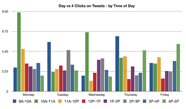 Looking at the data as a whole, mornings appear to be the most effective times to tweet, especially earlier in the week. While promotions should only be a small portion of your content, they may get the most attention in the morning early in the week. Unfortunately there really isn’t a good way to get at this data without doing some good old number crunching. It probably isn’t worth doing all the time, but you may want to do it once in awhile (or at least once) just to see how your own audience behaves.