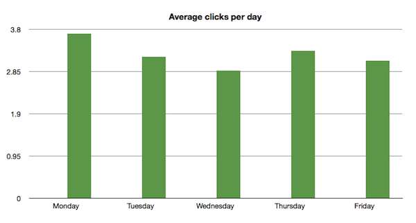 Interestingly enough, when you look at the average clicks per day without looking at the time of day, it’s fairly consistent. The beginning and end of the week have a slight edge over the middle (more work being done in the middle of the week?).