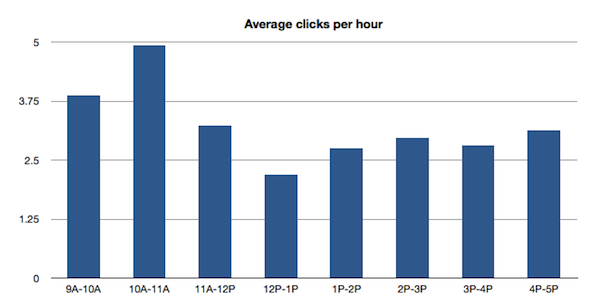 This really shows the trend towards clicks in the morning (except on Friday). Afternoons in general were worse than mornings and noon (lunch time) is the worst time of all.