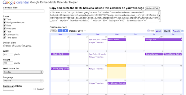 Click on “Customize the color, size and other options”. Here you can change the color, what information is show and how it is displayed. You can have the calendar displayed in the traditional calendar format or as an agenda (which I like). Also customize the size so it fits on your site. When you’re done, grab the code at the top and install it on your site (requires a bit of knowledge of html) and you’re done!