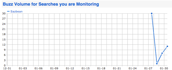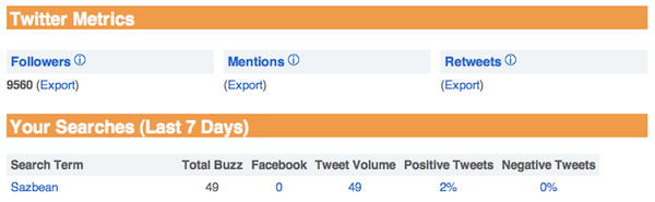 Top Influencers gives you an idea of who is really engaging with a brand, but it seems to be based on volume of tweets and number of followers, not necessarily the influencer’s true “influence”. Top Influencers for my search of “sazbean” include my own account which is not useful information. And how many followers a person has is not the best measurement of their true influence since it’s fairly easy to get a number of followers who don’t really engage.