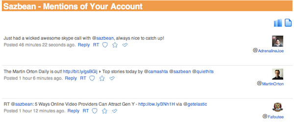 With a new account, results are only pulled for the past couple of days from Twitter. Keyword results were not pulling from recent blog posts for some reason and also were not showing results from Google Buzz even though there clearly are mentions there since I’ve posted to my blog and to Google Buzz recently.