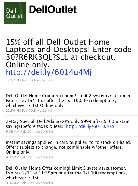 On the DellOutlet Twitter profile, they only post promotional material for sales and deals. There are no conversations or retweets, but the profile is clearly popular with 1.5 million followers: