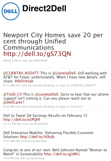 The Direct2Dell profile is the feed from the official Dell corporate blog, along with conversations about the content. It is staffed by LionelatDell (currently) who identifies himself in conversation tweets.