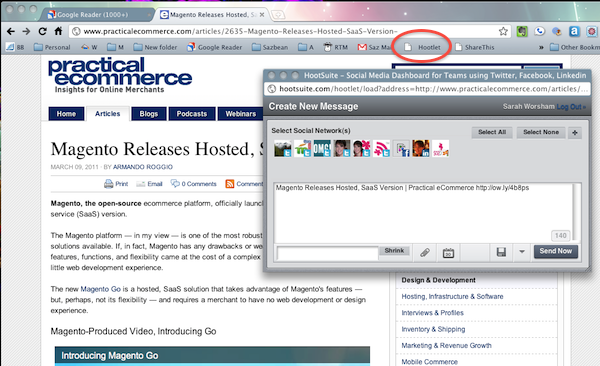 This brings up a smaller window that I can then use to send the link out to Twitter, Facebook, LinkedIn, etc. and can even schedule it for the future. I typically read through content in the morning with some coffee and setup some tweets and links to go out throughout the day. Then I can spend time interacting and engaging with people when I have breaks in work (or need breaks in work)