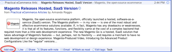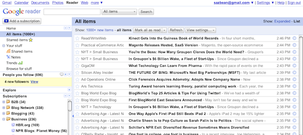 The first step is obviously to read through lots of different content sources and find great stuff to share. To do this, I am subscribed to over 200 websites and blogs. The ones that make sense for you will depend on your audience and industry. Take a look at Technorati or Google Blog search to find influencer blogs in your industry. Look also for websites and news organizations and associations that would be of interest to your audience (remember this is content for your audience, not necessarily for you). The nice thing about Google Reader is you can easily scan through a lot of different sources at a glance. Many sites also provide full RSS feeds, which means you can also read the articles inside Reader.