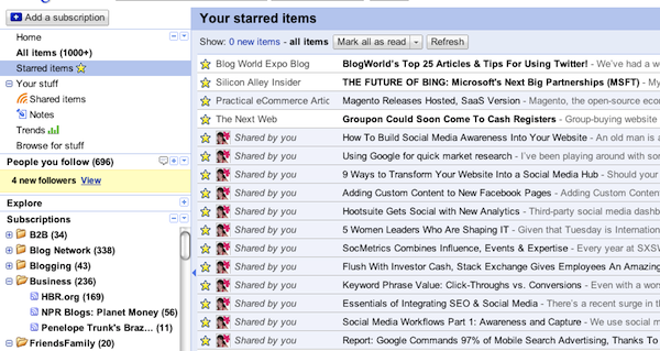 By viewing my Starred items in Reader, I can easily see the articles I’ve marked for sharing: