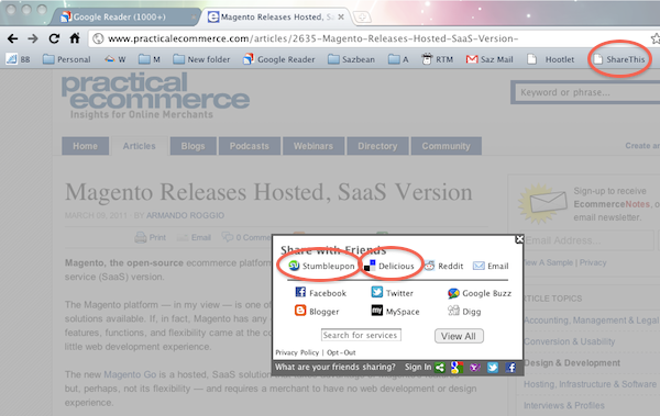 Next, I click the ShareThis button in my browser bar and share the content out to StumbleUpon and Delicious:
