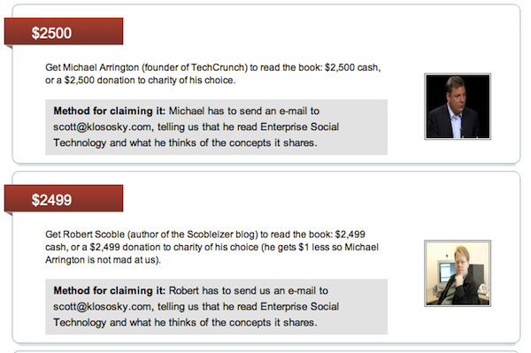 Scott Klososky recently published a new book, Enterprise Social Technology: Helping Organizations Harness the Power of Social Media, Social Networking, Social Relevance (affiliate link), which is also one of the first books to be crowdsourced from start to finish (cover design, content creation and publicity). As part of his marketing efforts, he has set up a series of “bounties” in return for promoting his book.