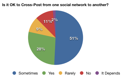 51% of those who answered (65) believe it’s ok to sometimes cross post and 28% believe that it is ok, for an overwhelming majority (79%). The results may not be surprising but there certainly was some interesting opinions…